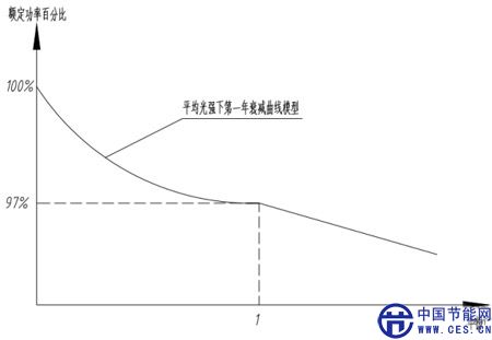 在實(shí)際中,光伏組件在制造出來后就一直處于衰減的狀態(tài),不過在包裝內(nèi)未見光時(shí)衰減非常慢,一旦開始接受太陽光照射后,衰減會(huì)急劇加快,衰減一定比例后逐漸穩(wěn)定下來,如圖4-1所示的第一年衰減曲線模型示意圖: