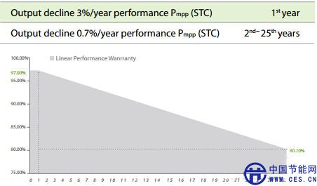 圖4-1中第一年3%的總衰減數(shù)據(jù)取自正泰太陽能多晶硅組件的25年衰減保證當(dāng)中,其25年衰減保證如圖4-2所示,