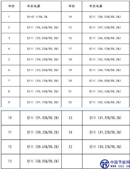 如采用PVSYST軟件估算光伏電站第一年發(fā)電量時(shí),系統(tǒng)效率里是沒有考慮電站自用電和停機(jī)時(shí)間這兩項(xiàng)的,但是不影響根據(jù)第一年的估算值來計(jì)算后面24年的預(yù)估發(fā)電量。根據(jù)前面的表述,用PVSYST估算第一年發(fā)電量時(shí),如果在Detailedlosses中Moduleefficiencyloss設(shè)定為1.5%,則表示第一年計(jì)算的組件平均效率為98.5%,則第二年估算發(fā)電量為第一年的98.12%,第三年為第一年的97.41%,第四年為第一年的96.70%,依次例推,可以看出從第二年開始,后面每年的預(yù)估發(fā)電量約在前一年的基礎(chǔ)上減少0.7%。
