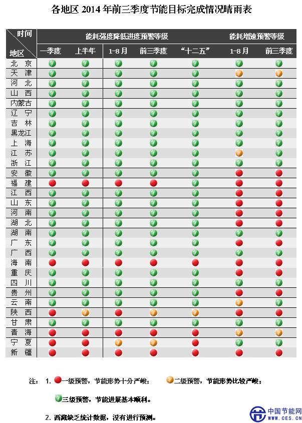 近日,國(guó)家發(fā)布了各地區(qū)2014年前三季度節(jié)能目標(biāo)完成情況晴雨表。通過(guò)對(duì)各地區(qū)節(jié)能形勢(shì)進(jìn)行分析,對(duì)照各地“十二五”年均節(jié)能任務(wù),前三季度,福建、海南、青海、新疆等4個(gè)地區(qū)預(yù)警等級(jí)為一級(jí),節(jié)能形勢(shì)十分嚴(yán)峻;陜西、寧夏等2個(gè)地區(qū)預(yù)警等級(jí)為二級(jí),節(jié)能形勢(shì)比較嚴(yán)峻;北京、天津、河北、山西、內(nèi)蒙古、遼寧、吉林、黑龍江、上海、江蘇、浙江、安徽、江西、山東、河南、湖北、湖南、廣東、廣西、重慶、四川、貴州、云南、甘肅等24個(gè)地區(qū)預(yù)警等級(jí)為三級(jí),節(jié)能工作進(jìn)展基本順利。與1-8月相比,陜西由一級(jí)預(yù)警下降為二級(jí)預(yù)警。西藏缺乏統(tǒng)計(jì)數(shù)據(jù),沒(méi)有進(jìn)行預(yù)測(cè)。