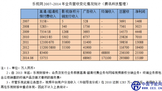 樂視網(wǎng)2007~2014年業(yè)務(wù)營收變化情況統(tǒng)計(jì)(騰訊科技整理)