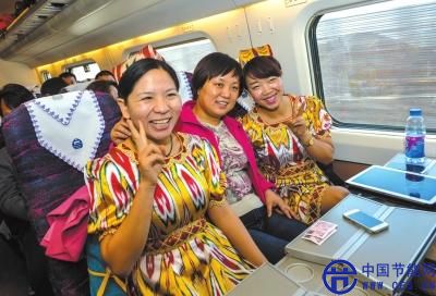 11月16日,來(lái)自湖北的孫珍珍(左)和烏魯木齊的劉雪琴(右)乘坐D8602次列車時(shí)特意穿上了民族服裝。