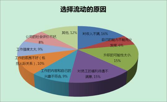 由此可以看出,真正影響人才流動(dòng)的主要是收入、升職空間以及對(duì)員工的福利待遇。這些與個(gè)人的能力、主觀認(rèn)識(shí)以及企業(yè)的制度是分不開的,而因工作內(nèi)容和自己興趣不符合而離職的人才也占有一部分比例,這主要是個(gè)人原因?qū)е碌摹F渌蜻€包括,工作地的選擇,家庭因素等,這些都是人才流動(dòng)的次要原因。