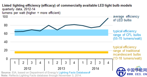 LED照明的光效提升了大約50%(圖片源自美國能源信息署)
