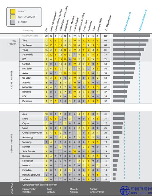 我們不妨看一看這份排名的廬山真面目。該榜單更新于1月11日,在評(píng)分報(bào)告中,天合光能在12項(xiàng)指標(biāo)中有11項(xiàng)獲得最高分,8項(xiàng)獲得滿分,以總分92分的佳績?cè)趨⒃u(píng)的全球29家太陽能企業(yè)中位列第一。英利綠色能源宣布也獲得了第三高的平均分。然而,值得注意的是,在這個(gè)榜單中,有由多家企業(yè)的某些項(xiàng)目排名都為0分,而前五位的所謂綠色生產(chǎn)領(lǐng)導(dǎo)者的被評(píng)選項(xiàng)目都很全,前三名的三家企業(yè)每項(xiàng)估值都有較好的分?jǐn)?shù)。