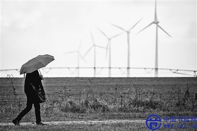 一位女士從德國柏林南部菲利德海姆村的風力發(fā)電廠旁邊經(jīng)過,該村已經(jīng)實現(xiàn)100%可再生能源發(fā)電。