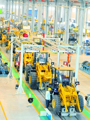 圖為山東青州市一工程機械企業(yè)工人在車間內(nèi)組裝生產(chǎn)裝載機。