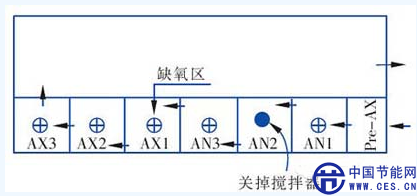位于美國內華達州的Henderson NV污水廠平均處理能力為8×104m3/d,圖3是該廠新建的一組生物池型及平面布置,處理能力為23 000 m3/d。該系列在啟動期進水中VFA<5mg/L,無法滿足EBPR要求,因此,運行人員將厭氧區(qū)第二個分格中的攪拌器關掉,每天只進行15min左右的短時攪拌,進行混合液在線發(fā)酵,即按照“UMIF”模式運行。