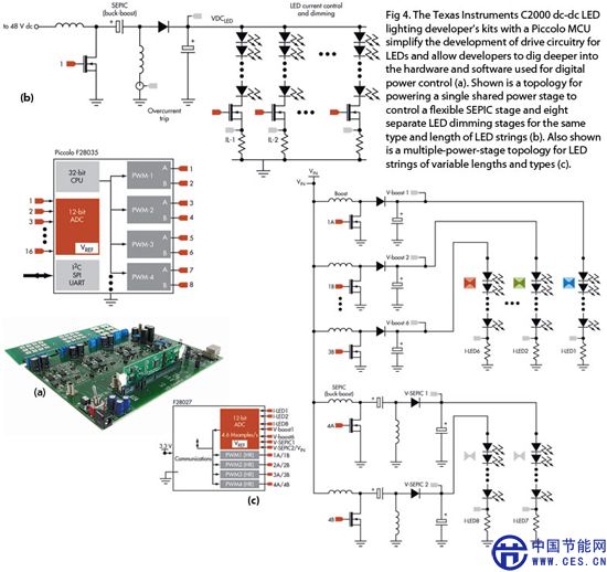 德州儀器C2000微控制器單元(MCU)營(yíng)銷總監(jiān)Patrick Carner認(rèn)同這種看法。他也指出,德州儀器宣稱其Piccolo MCU可以用于LED驅(qū)動(dòng)器解決方案,允許設(shè)計(jì)者“進(jìn)一步深入數(shù)字電源控制所使用的硬件和軟件”。該公司的C2000 dc-dc LED照明開(kāi)發(fā)者工具顯示出,驅(qū)動(dòng)單一或多個(gè)共享功率極所需要的正確電源拓?fù)?圖4)。
