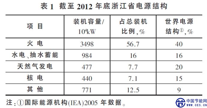 浙江省作為東部沿海經(jīng)濟發(fā)達省份,能源需求隨著工業(yè)化、城市化、現(xiàn)代化進程的不斷推進而突飛猛進。截至2012年底,浙江省電力總裝機容量為6170×10^4kW,電源結構見表1。