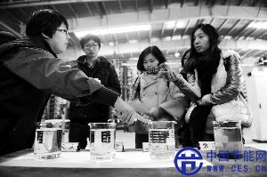 清河再生水廠工作人員展示污水處理過程中的四個樣本。