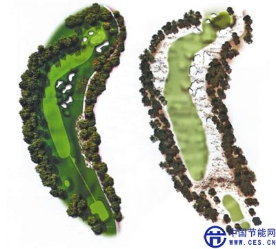 松樹叢2號球場7號洞改造前(左)后的對比圖,改造后的球道變寬,長草區(qū)消失。