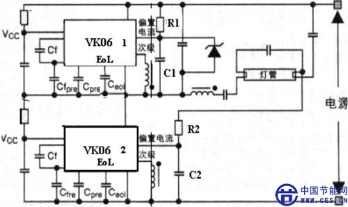 圖2 應(yīng)用VK06TL驅(qū)動(dòng)電路的一個(gè)熒光燈鎮(zhèn)流器專用的驅(qū)動(dòng)器