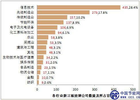 從掛牌公司行業(yè)分類來看,以往信息技術(shù)行業(yè)占半壁江山的情況已經(jīng)逐步改變,先進(jìn)制造業(yè)和節(jié)能環(huán)保等新興產(chǎn)業(yè)正分秋色。目前,占據(jù)掛牌公司數(shù)量前三甲的依然是信息技術(shù)和制造業(yè),節(jié)能環(huán)保產(chǎn)業(yè)排行第四,占比為8.9%。