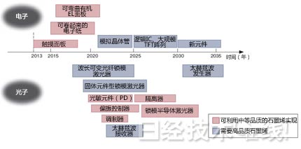 EU的開發(fā)項(xiàng)目“Graphene Flagship”給出了采用石墨烯的碳元件的具體時(shí)間表(圖1)。光激勵(lì)發(fā)光元件大多在2020年前后,邏輯IC在2025年前后開始實(shí)用化。