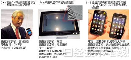 采用CNT或石墨烯的觸摸面板產(chǎn)品及試制示例。開發(fā)(a)的觸摸面板的富納源創(chuàng)已從2011年開始量產(chǎn)。東麗預(yù)定2014年內(nèi)量產(chǎn)(b)。三星泰科沒有公布量產(chǎn)時(shí)間(c)。((c)由成均館大學(xué)拍攝)