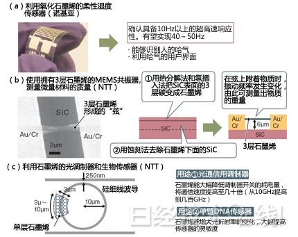 本圖為利用石墨烯的傳感器開發(fā)示例。諾基亞的濕度傳感器響應(yīng)性非??欤╝)。石墨烯MEMS共振器正針對(duì)微量材料的測(cè)量用途進(jìn)行開發(fā)(b)。硅環(huán)型光調(diào)制器可將通信性能提高至數(shù)十倍(c)。(圖(c)由NTT提供,圖片由各公司拍攝)