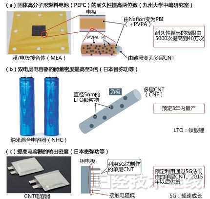 本圖為CNT在燃料電池、雙電層電容器及電容器等領(lǐng)域的利用方法以及利用CNT提高的性能。((a)由九州大學(xué)拍攝,(b)和(c)由日本貴彌功拍攝。)