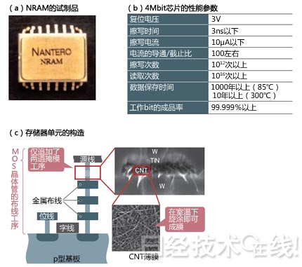 核心提示: 電路:速度與SRAM相當(dāng)?shù)拇鎯?chǔ)器  利用CNT的存儲(chǔ)器也即將發(fā)布產(chǎn)品(圖5)。比如美國(guó)Nantero公司開(kāi)發(fā)的NRAM。其最大特點(diǎn)是擦寫速度還不到3ns
