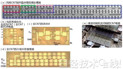 在芯片上集成CNT晶體管制作IC和微處理器的趨勢(shì)擴(kuò)大。(a)是斯坦福大學(xué)采用CNT制作的微處理器。集成了178個(gè)晶體管,具備計(jì)算機(jī)的所有基本功能。(b~e)是名古屋大學(xué)大野研究室的IC系列。最大集成了約100個(gè)TFT。TFT自不必說(shuō),電極和布線也全部采用CNT實(shí)現(xiàn)。(攝影:各大學(xué))
