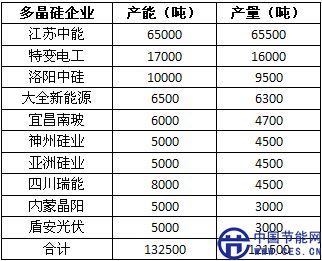 數(shù)據(jù)顯示,2014年,包括江蘇中能、特變電工、洛陽(yáng)中硅、大全新能源、宜昌南玻、神州硅業(yè)、亞洲硅業(yè)、四川瑞能、內(nèi)蒙晶陽(yáng)、盾安光伏在內(nèi)的十家主要多晶硅企業(yè)總產(chǎn)能達(dá)到132,500噸,總產(chǎn)量達(dá)到121,500噸。