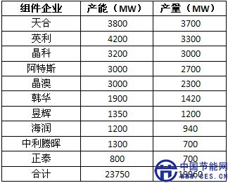 組件環(huán)節(jié),天合、英利、晶科、阿特斯、晶澳、韓華、昱輝、海潤(rùn)、中利騰暉、正泰等十家企業(yè)的總產(chǎn)能達(dá)到23,750MW,總產(chǎn)量達(dá)到19,960MW。