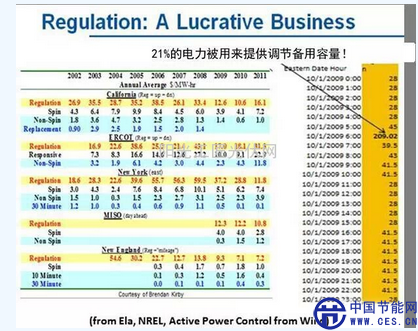 要滿足平衡電網(wǎng)的需求,調(diào)節(jié)備用容量在輔助服務(wù)市場將是收益非??捎^的一項(xiàng)服務(wù)。通常電力市場在調(diào)節(jié)備用容量服務(wù)上的支出比購買能源本身高很多,而且隨著更多新能源并入電網(wǎng),這種花費(fèi)將更加頻繁。艾拉舉例說,現(xiàn)如今備用容量市場已達(dá)到每千瓦時$0.21(每兆瓦時$209.02)。