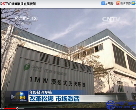2014年12月8日中央電視臺《新聞聯(lián)播》播出“改革松綁市場激活”的新聞。在采訪正泰新能源公司副總經(jīng)理過程中,講述當前光伏電站建設審批由繁化簡,激活了當前光伏市場的發(fā)展活力。在光伏電站系統(tǒng)建設中,正泰電源系統(tǒng)的兆瓦光伏預裝系統(tǒng)承擔了重要角色。