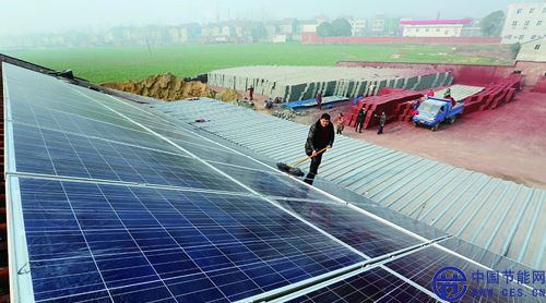 丁洪權(quán)是鐘祥市雙河鎮(zhèn)南棚村2組人,經(jīng)常關(guān)注我國新能源方面的新聞,對光伏電站有一定的了解。2014年11月,丁洪權(quán)萌生了在自家彩瓦廠廠房頂上建設(shè)家庭光伏電站的想法,并向國網(wǎng)荊門供電公司客戶服務(wù)中心提出申請。昨日11時許,記者在現(xiàn)場看到,60塊藍白相間的光伏板分布在彩瓦廠的兩棟廠房頂部,丁洪權(quán)正在用拖把清掃光伏板上的灰塵(如圖)。