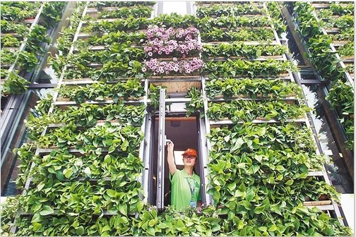 設(shè)計師給出了答案:水源都是通過收集屋頂?shù)挠晁惭b智能噴灌系統(tǒng),對墻面植被自動灌溉,降低了房屋在給水方面的碳排放。