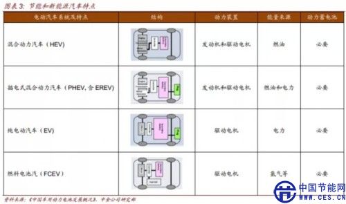 目前我國將插電式混合動(dòng)力汽車(PHEV,含EREV)、純電動(dòng)汽車(EV)和燃料電池汽車(FCEV)歸為新能源汽車;將普通的混合動(dòng)力汽車(HEV)認(rèn)定為節(jié)能型汽車。這些車型均需要?jiǎng)恿π铍姵?,但是能量來源和?dòng)力裝臵的布臵有所不同。