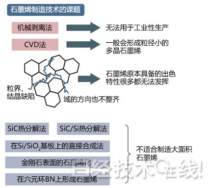 ?。?)沒有可獲得大面積單晶石墨烯的工業(yè)合成法、(2)未確立獲得帶隙的方法。