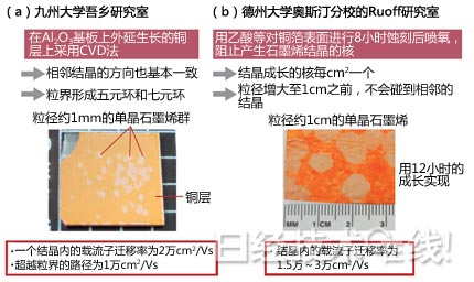 圖為面積較大的單晶石墨烯合成取得成功的兩種方法和結(jié)果。九州大學(xué)吾鄉(xiāng)研究室采用了使作為催化劑的銅箔的面方向一致的方法(a)。而德州大學(xué)奧斯汀分校的Ruoff研究室為了讓結(jié)晶之間盡量不碰撞,采用了減少結(jié)晶核密度的方法(b)。兩種方法的載流子遷移率作為基板上的石墨烯來說都非常高。((b)由德州大學(xué)奧斯汀分校拍攝)