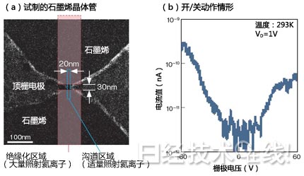 本圖是在晶圓上形成石墨烯圖案,并將部分制成半導(dǎo)體型的技術(shù)。用氦離子顯微鏡向石墨烯照射氦離子,根據(jù)照射強(qiáng)度的不同,或形成半導(dǎo)體型,或形成絕緣體。利用該技術(shù)制造的石墨烯晶體管在室溫環(huán)境下,電流的導(dǎo)通/截止比實(shí)現(xiàn)了約100的開關(guān)性能。(圖和照片由產(chǎn)業(yè)技術(shù)綜合研究所提供)