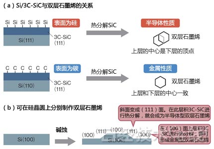 雙層石墨烯根據(jù)上下層的重疊方法的不同,分為有帶隙和沒帶隙的情況(圖6)。利用對(duì)硅上的3C-SiC薄膜進(jìn)行熱分解的方法在硅(111)面上形成的雙層石墨烯為半導(dǎo)體型,在其他硅面上形成的雙層石墨烯為金屬型。末光等人發(fā)現(xiàn),通過硅(100)晶圓表面的蝕刻形成傾斜面的話,傾斜面會(huì)變成硅(111)。