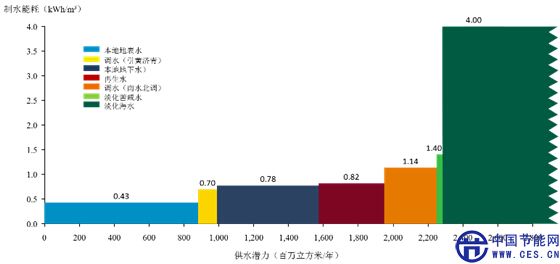 注: 1. 青島市不同水源的供水潛力根據(jù)《青島市水資源公報(bào)》(青島市水利局,2012)和《青島市海水淡化發(fā)展規(guī)劃》(青島市發(fā)改委,2005)估算。 2. 不同類型水源的單位制水能耗根據(jù)世界資源研究所的實(shí)地訪談和文獻(xiàn)(如Cohen等,2004;新加坡公用事業(yè)局,2012)進(jìn)行估算。來源:《城市水源選擇的水-能源關(guān)聯(lián)分析:以青島為例》,世界資源研究所,2014