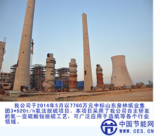 明晟化工于2014年5月以7760萬元中標(biāo)的山東泉林紙業(yè)集團(tuán)3×520t/h氨法脫硫項(xiàng)目。采用自主研發(fā)的氨—亞硫酸銨脫硫最新工藝,可將廢氨水高效脫除二氧化硫之后,生成一定濃度的亞硫酸銨溶液,直接用于紙廠制漿,解決環(huán)保問題的同時(shí)還能夠轉(zhuǎn)換成生產(chǎn)原料,最大程度的實(shí)現(xiàn)廢物再循環(huán)利用,凸顯了氨法脫硫的先進(jìn)性、實(shí)用性和經(jīng)濟(jì)性。同時(shí),此套工藝在氨法脫硫領(lǐng)域填補(bǔ)了國(guó)內(nèi)空白,彰顯了明晟氨法脫硫的技術(shù)先進(jìn)性和行業(yè)領(lǐng)導(dǎo)者的位置。