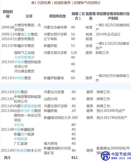 截至2013年,國(guó)家發(fā)改委共核準(zhǔn)了4個(gè)煤制氣示范項(xiàng)目,合計(jì)產(chǎn)能達(dá)151億立方米/年。分別是大唐發(fā)電遼寧阜新40億立方米/年項(xiàng)目、大唐發(fā)電內(nèi)蒙古赤峰克旗40億立方米/年項(xiàng)目、內(nèi)蒙匯能鄂爾多斯16億立方米/年項(xiàng)目和新疆慶華集團(tuán)伊犁55億立方米/年項(xiàng)目。其中,大唐克旗項(xiàng)目一期13億立方米/年和新疆慶華伊犁項(xiàng)目一期13.5億立方米/年工程均已建成投產(chǎn)。