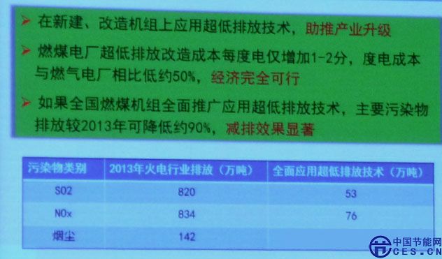 “如果全國燃煤機(jī)組全面推廣應(yīng)用超低排放技術(shù),主要污染區(qū)排放較2013年可降低90%,減排效果顯著。改造成本每度電僅增加1-2分,度電成本與燃?xì)怆姀S相比低約50%,經(jīng)濟(jì)完全可行。”
