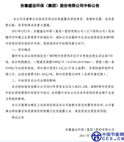 盛運股份近日午間公告稱,2015年2月3日,公司收到中標通知書,中標海南省儋州市生活垃圾焚燒發(fā)電BOT特許經營權項目。