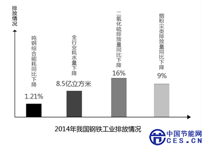 2014年,我國(guó)鋼鐵行業(yè)噸鋼綜合能耗同比下降7.17千克,同比下降1.21%;全行業(yè)耗水量下降8.5億立方米,再創(chuàng)近年來(lái)新記錄;行業(yè)二氧化硫排放量同比下降16%;煙粉塵類排放量同比下降9%;整體行業(yè)的煤氣、高爐煤氣等利用率普遍提高。我國(guó)鋼鐵行業(yè)節(jié)能環(huán)保整體水平再上新臺(tái)階。