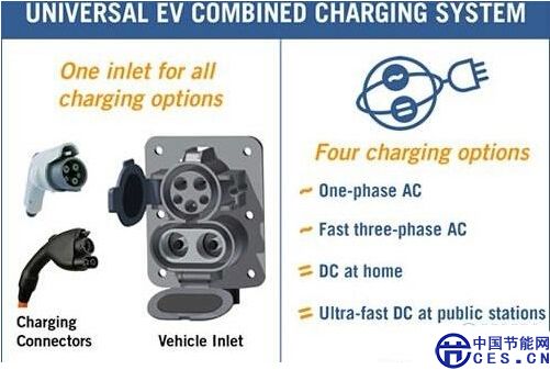 “聯(lián)合充電系統(tǒng)”可將現(xiàn)行所有充電接口統(tǒng)一起來(lái),這樣,用一種接口就能夠完成單相交流充電、快速三相交流充電、家用直流充電和超速直流充電四種模式。