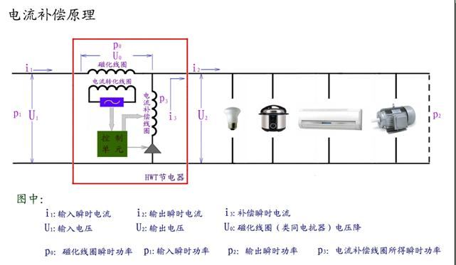 在沒有安裝節(jié)電器時,i1= i 2(既輸入瞬時電流等于輸出瞬時電流)。安裝節(jié)電器后,輸入瞬時電流i1通過節(jié)電器內(nèi)的磁化線圈向負載端供電。磁化線圈(同電抗器)串聯(lián)在主回路中,當有電流通過時即在其兩端產(chǎn)生壓降。同時由于負載端的用電設備比較復雜,設備開停頻繁,這樣就產(chǎn)生了浪涌、諧波等有害于用電設備正常工作和多余消耗的電能量,當安裝節(jié)電器后,這些雜波反饋不到主回路中,因為有磁化線(類同電抗器的功能)所阻擋并吸收(轉(zhuǎn)化為磁能),在由電流補償線圈通過電磁轉(zhuǎn)化所吸收,并將轉(zhuǎn)化后的電流反向同步補償給負載。