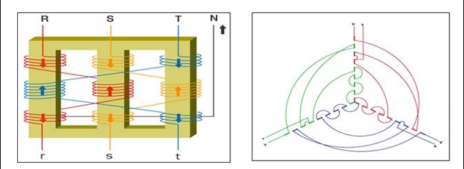 如上,在各相位中線圈相互正對接線,負荷中產(chǎn)生的零相分電流的相位相互對立,使磁勢相互抵消,從而使零序電流的增長減少。