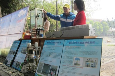 現(xiàn)場展出了“覆水‘能’收:與下水道U形管集成的廢水降解發(fā)電裝置”、“基于異形熱管的廢熱溫差發(fā)電裝置”以及“熱能與太陽能兩級預(yù)熱溫度可調(diào)的供水亭”三件作品,此三件作品曾分別獲得全國第六屆大學(xué)生節(jié)能減排社會實(shí)踐與科技作品競賽一等獎,二等獎以及重慶大學(xué)2014年大學(xué)生節(jié)能減排社會實(shí)踐與科技作品競賽三等獎。