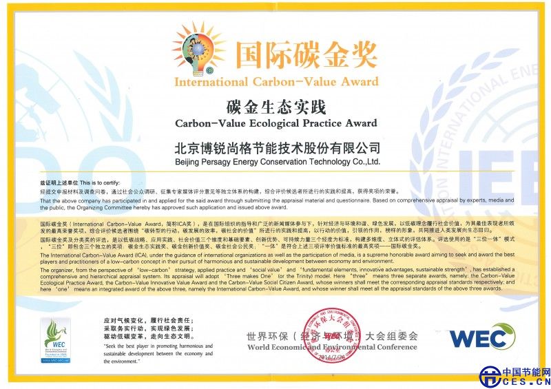 據(jù)世界環(huán)保大會組委會介紹,本次國際碳金獎評選組委會由國內外非政府組織和行業(yè)代表、知名專家、學者、新聞媒體組成。根據(jù)參評企業(yè)所屬類別區(qū)分,采取隨機抽簽方式,邀約相關領域的專家給出評選指導意見,并在第三方調研問卷和專家指導意見的基礎上進行最終綜合評定。經過多次篩選評定,最終此次“碳金生態(tài)實踐”獎花落博銳尚格。評選委員會一致認為:“博銳尚格作為中國最早專注能源管理解決方案開發(fā)、實施和運營的高新技術企業(yè)。始終堅持低碳環(huán)保的經營理念,不斷嘗試、勇于探索,致力于為全社會提供全生命周期節(jié)能解決方案產品及服務。長期以來,博銳尚格為促進社會綠色發(fā)展起到了重要作用,因此將 “碳金生態(tài)實踐”獎授予博銳尚格可謂眾望所歸。”