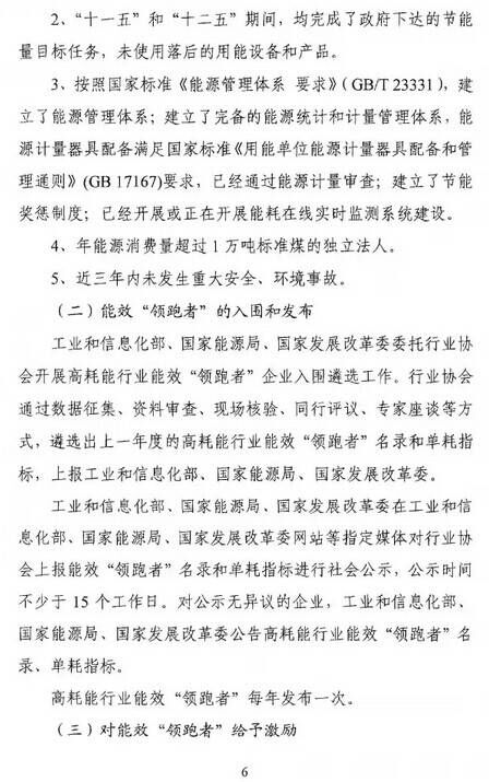 工業(yè)和信息化部、國(guó)家能源局、國(guó)家發(fā)展改革委委托行業(yè)協(xié)會(huì)開(kāi)展高耗能行業(yè)能效“領(lǐng)跑者”企業(yè)入圍遴選工作。行業(yè)協(xié)會(huì)通過(guò)數(shù)據(jù)征集、資料審查、現(xiàn)場(chǎng)核驗(yàn)、同行評(píng)議、專家座談等方式,遴選出上一年度的高耗能行業(yè)能效“領(lǐng)跑者”名錄和單耗指標(biāo),上報(bào)工業(yè)和信息化部、國(guó)家能源局、國(guó)家發(fā)展改革委。工業(yè)和信息化部、國(guó)家能源局、國(guó)家發(fā)展改革委在工業(yè)和信息化部、國(guó)家能源局、國(guó)家發(fā)展改革委網(wǎng)站等指定媒體對(duì)行業(yè)協(xié)會(huì)上報(bào)能效“領(lǐng)跑者”名錄和單耗指標(biāo)進(jìn)行社會(huì)公示,公示時(shí)間不少于15個(gè)工作日。對(duì)公示無(wú)異議的企業(yè),工業(yè)和信息化部、國(guó)家能源局、國(guó)家發(fā)展改革委公告高耗能行業(yè)能效“領(lǐng)跑者”名