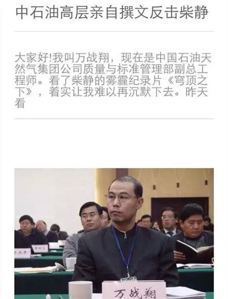 而在今天下午,中國石油天然氣集團(tuán)公司質(zhì)量與標(biāo)準(zhǔn)管理部副總工程師萬戰(zhàn)翔也親自撰文參戰(zhàn)反擊柴靜。