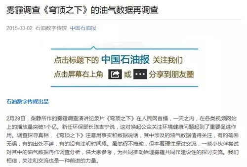 《中國石油報(bào)》則發(fā)布了一篇油氣數(shù)據(jù),對柴靜視頻中涉及的油氣數(shù)據(jù)進(jìn)行了調(diào)查分析并予以糾正。