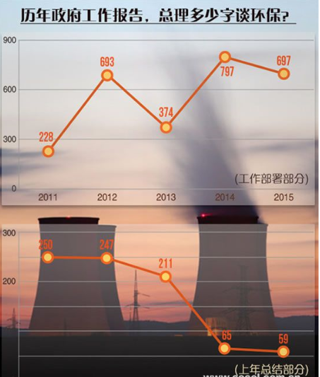 在去年(2014年)政府工作報告中,李克強總理談及環(huán)保部署的文字達到797字,為近5年最高。而統(tǒng)計2011年-2015年政府工作報告的工作部署內(nèi)容,可以發(fā)現(xiàn)李克強總理談及環(huán)境保護的文字明顯增多,而溫家寶總理時期,除了2012年使用693字以外,2011年和2013年篇幅均為兩三百字(2012年為“十二五”布局之年)。